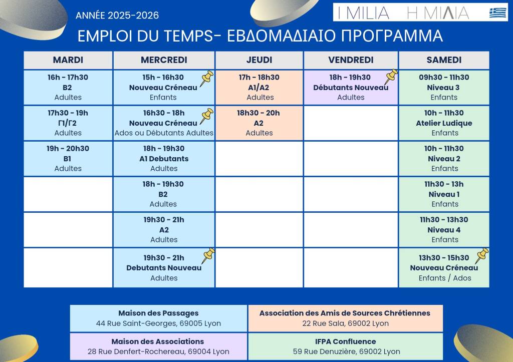 Nous avons la chance de pouvoir organiser les cours cette année à quatre endroits dans Lyon et de les réaliser grâce à l’aide de l’enseignante détachée Evdoxia Papadopoulou et des enseignant.es, Filippos Karaferias & Maria Tsouka que nous remercions chaleureusement.